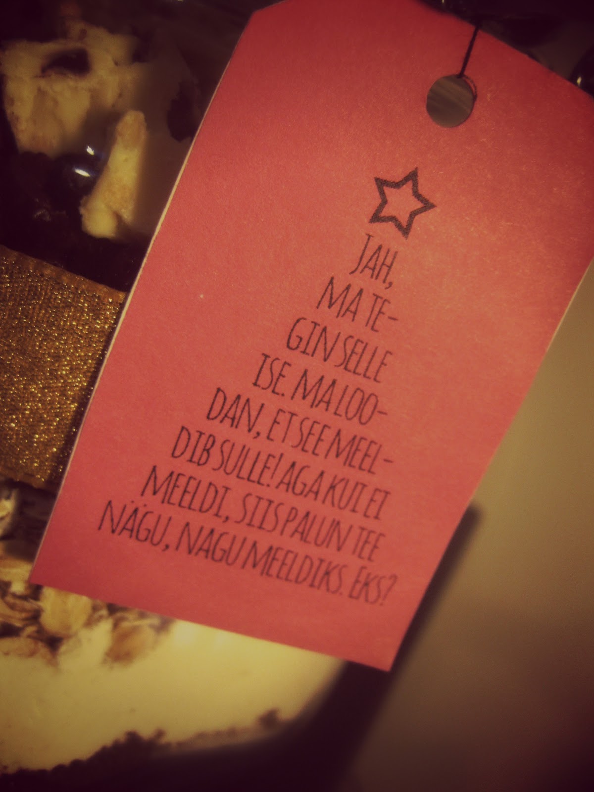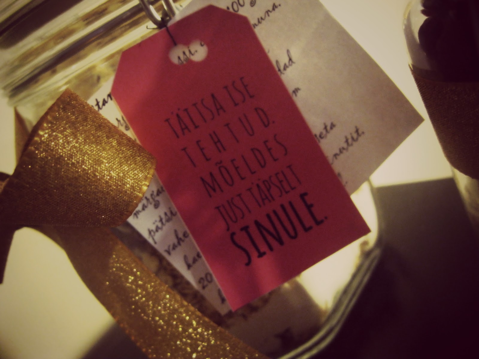 Kingitus ise on väga lihtne. Sa pead kodust otsima või poest ostma ühe mõnusa purgi ja sinna kihtidena laduma küpsisteks vajaminevad kuivained, siduma armsa lipsu peale või kaunistama ükskõik kuidas ja juurde lisama lihtsalt küpsiste valmistamisõpetuse. Kingisaaja peab juurde lisama vaid ühe muna ja 100 g võid. Purk võiks olla 1 liitrine ja kihid tuleb laduda retsepti järjekorras.