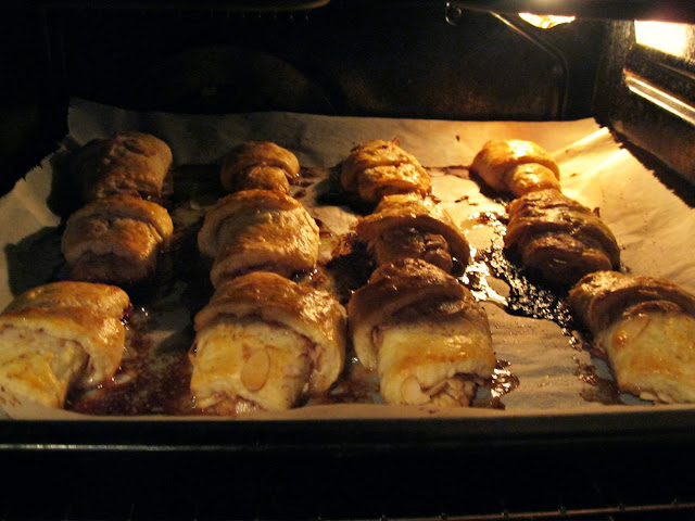 Tee valmis täidisepoiss. Vahusta suhkur ja või ning määri see oma tainakette peale. Laota peale mandlilaastud ja raputa mõnusalt ka kaneeli. Siis hakka oma tainaringist kolmnurki välja lõikama. Nagu pizzat lõikaks... 12 kolmnurka peab siis tulema. Et sa saaksid sellised mõnusad sarvekesed, rulli saadud kolmnurgad laiemast otsast lihtsalt rulli. Nüüd määri saiakesed pealt munaga, et lõpptulemus oleks kuldne. Küpseta neid 180 kraadises ahjus umbes 20 min.Igaksjuhuks tseki neid ka varem, sest ahjud võivad olla salakavalad ja õelad.
