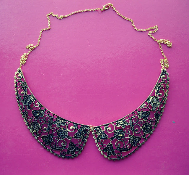 Olen siin hetkel kodus ja surmväsinud, sest saabusin just 8. tunniliselt koolipäevalt, kus keka tunnis tegin veel suusaarvestust...oli see alles kohutav. Viimase ehk 10. ringi juures mõtlesin lausa, et annan alla, aga vot ära tegin. Minu puhul on see suur saavutus, sest ma selline suusatamise hater. Igatahes.. täna siis tahtsin pajatada ühest kelmarist eBay avarustest tellitud collar necklace'ist, millesse ma juba täiesti armunud olen. Olen juba pikemat aega endale sellist ihaldanud, kuid poodides leiduvad on olnud ebakelmikad või siis maksnud nii mõttetut ja üüratut hinda, et lihtsalt otsustasin lõpuks eBay kasuks. Klõpsasin sellest nunnust siis eile enne lauluarvestusele minekut ka mõned pildid. Lisan ka teile lingi, et soovi korral saaksite endalegi selle soetada.