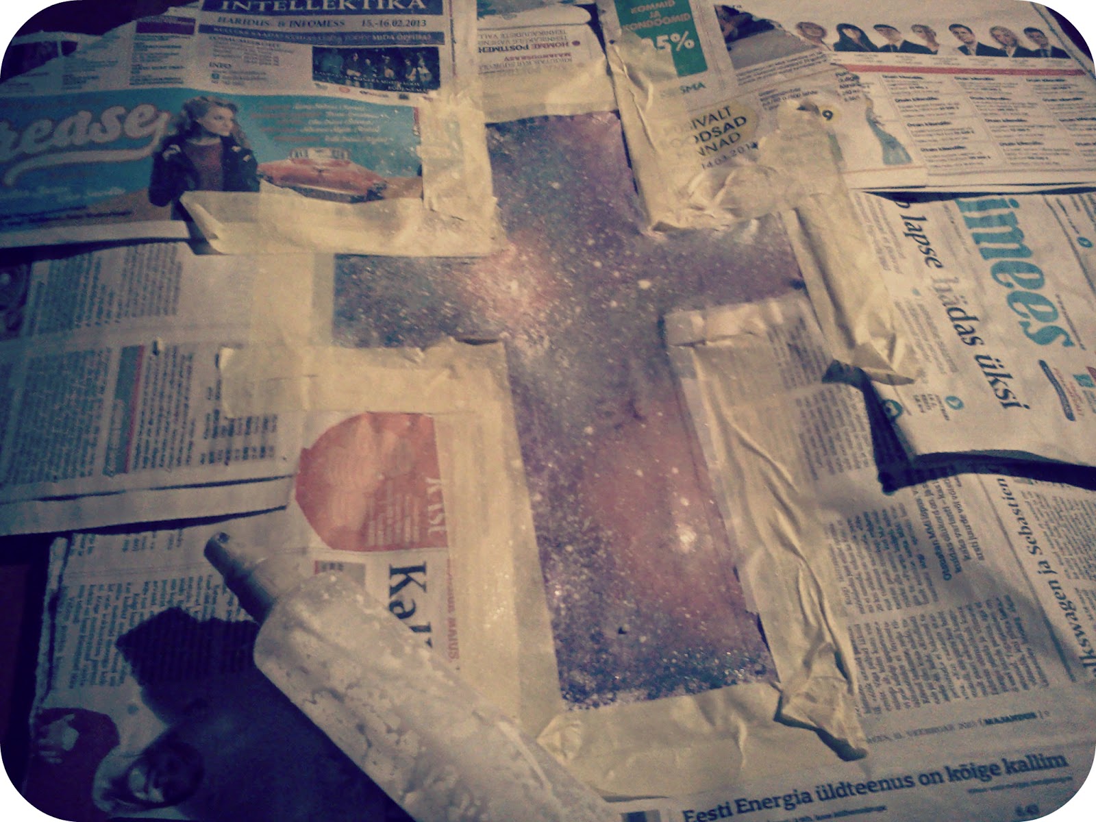 Lisa ka halli värvi ning lõpuks ka roosasid laike. Roosade laikude keskele tee näpuga hele valge täpp, siis see on nagu täht või midagi.. Ma lõpuks hakkasin isegi küünelakke sinna värvide kombinatsiooni toppima, et sädelust ka saada :D Igatahes kui need sammud läbitud, kata kogu ümbrus ajalehtedega või mingite paberitega nii, et särk jääks suht täielikult nende alla, muidu määrdub!