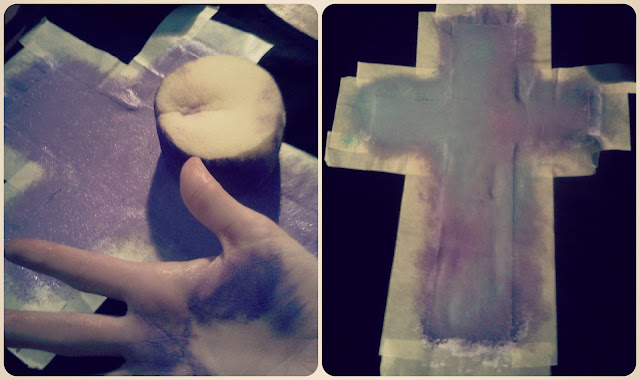 Kui valge värv on kuivanud (ma kasutasin kiiremaks kuivatamiseks fööni), kata see rist helelilla värviga. Selleks kasuta mingit lambikat käsna. Kui ka lilla osa on kuivanud, lisa sinakat-rohekat tooni sedasi hajutades.