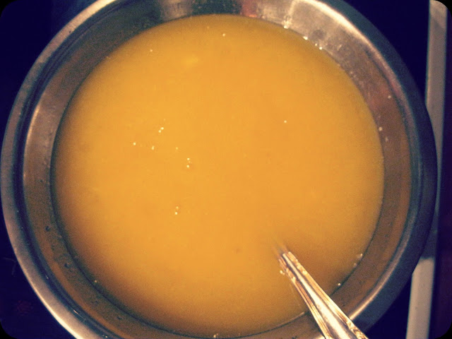 Sulata või metallkausis või kastrulis, eemalda siis see kuumalt pinnalt, lisa sinna suhkur, sega veidi ning pane taas korraks pliidi peale, et see sedasi sulanduks.See ei pea täiesti ära sulama, lihtsalt et selline suhteliselt ühtlane mass oleks, aga samas see on ikka selline teraline.