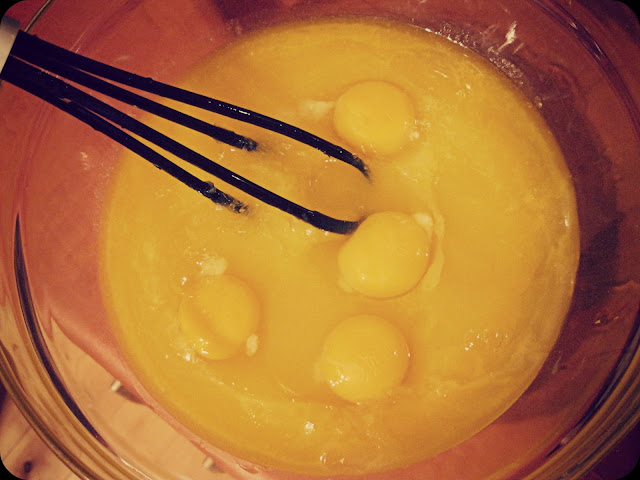 Aseta kogu segu suurde kaussi ning lisa munad ning vispelda õrnalt, kuid mitte liiga palju!