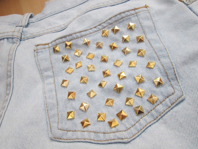 Esmalt siis lõikasin nad selliseks, nagu tahtsin.. ei pidanud vajalikuks ääri ära keerata, vaid pigem lasen neil narmeneda. Ja kui nad olid pikkuselt okeid, siis mõtlesin, et peaks millegagi vürtsi lisama, nagu alati. Mõttes oli siis, kas pits, hõbedad needid või kuldsed needid. Polnud veel kordagi neid kuldseid needipoisse pannud kuhugi, hakkas täitsa kahju neist ja siis toppisin need sinna!