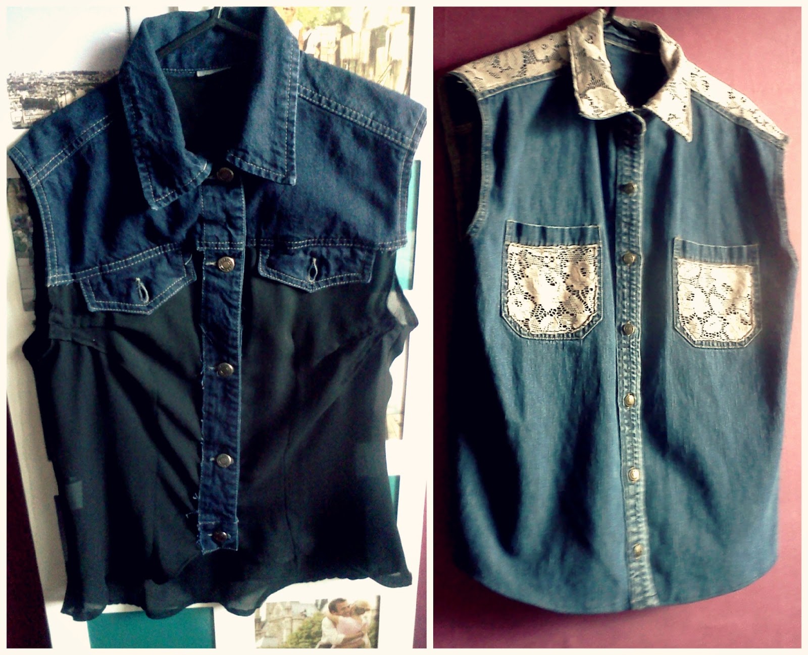 Esiteks lõikasin siis teksajakilt selle ülemise osa ning nööpide koha välja. Seejärel lõikasin sellel mustal pluusil ära varrukad ning ühendasin ta nõeltega selle teksaosaga . Siis õmblesin need kokku, lõikasin alt särki lühikesemaks ning voilaaa, valmis!