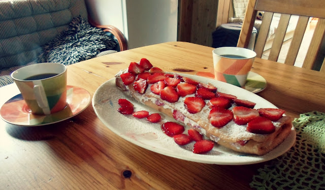 Täna tuli Marili meie juurde enda valget iludust pesema ning õues ta autole šampooni peale pritsides tabas mind järsku ahastus. Mulle meenus, et meil ei ole hetkel kodus mitte ühtegi kooki, mida pakkuda. Eilsed külmad pannkoogid pole ka eriti fäänsid ning cmooon...tavalisi poeküpsiseid või komme pole ka kelmikas lauale panna. Mõtlesin siis ruttu, mis valmiks imekergelt ning otsustasin rullbiskviidi kasuks, sest selle tegemiseks kulub maksimaalselt 15-20 minutit ning kuna aed on juba mahlaseid ja punaseid maasikaid täis, siis kujutasin juba vaimusilmas ette, kui mõnusalt see mekiks.