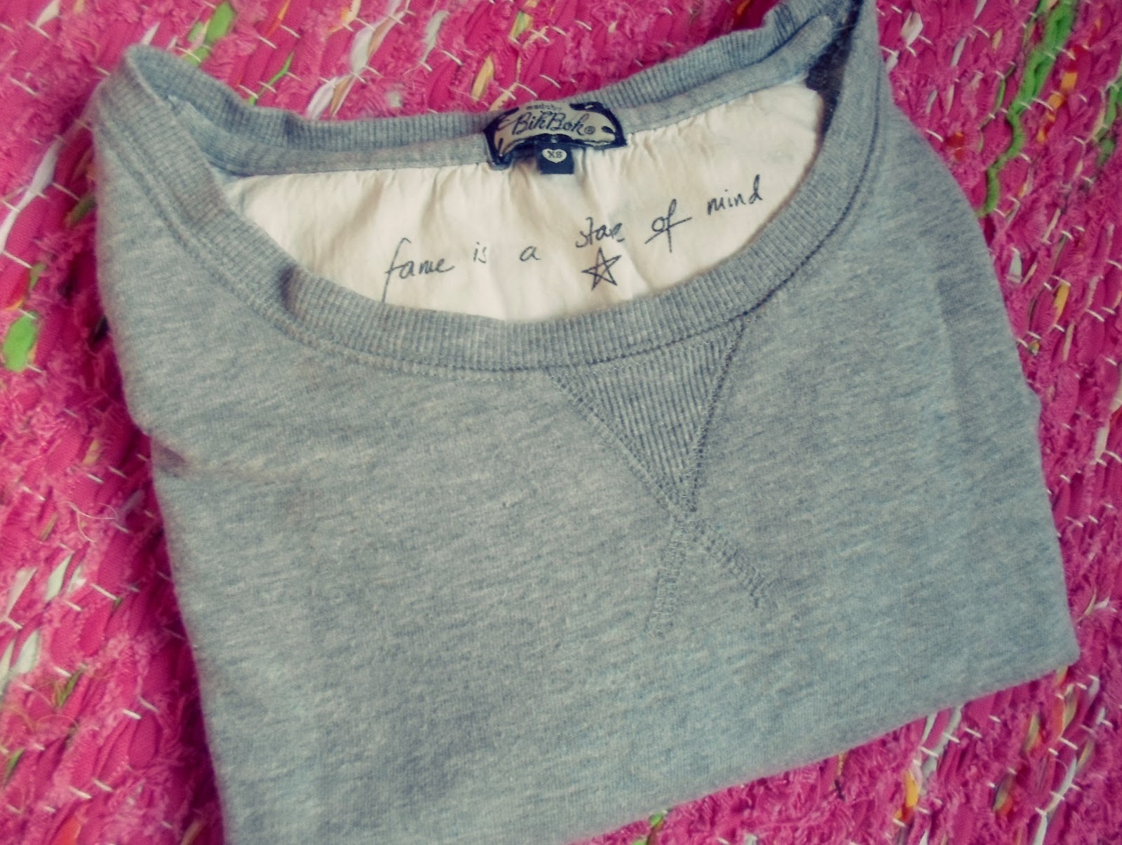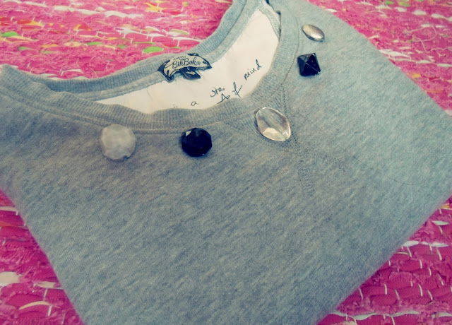 Leidsin täna õhtul oma sahtlist juhuslikult hulgaliselt pärleid ja mul oli kohe vajadus neid kuskile õmmelda. Pimpisin siis lõpuks üht tavalist halli pluusi/džemprit või kuidas iganes seda nimetataksegi ning lõpptulemus tuli vähemalt minu arvates täitsa kelmikas välja.