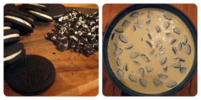 Täidise tegemiseks kuumuta kõigepealt rõõsk koor ning sulata selles valge šoklaad. Lase sellel segul natuke jahtuda ning vahusta samal ajal toorjuust, lisa ühekaupa munad ning seejärel šokolaadi-koore möks. Murra teise küpsisepaki küpsised neljaks (aga jäta kindlasti 4 tükki kaunistamiseks) ning sega need täidisega kokku. Vala nüüd täidis küpsisepõhjale.