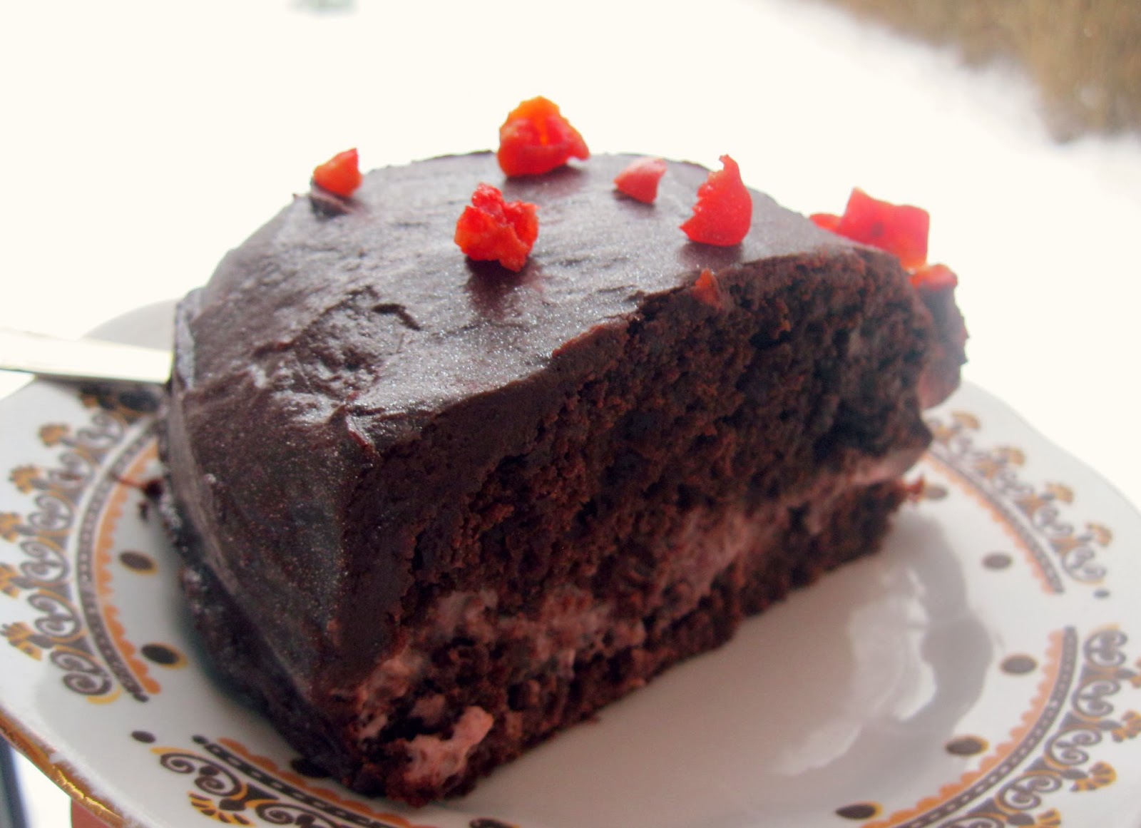 Eelmisel nädalal käis mul Mihkel külas ning pärast pitsa söömist tahtsin ma ka midagi magusat. Kuna mu mõtetes mõlkus juba mõnda aega üks mõnus ja mahlane šokolaadikook, siis valmiski selline väike ja armas tort, mis on minu arvates oma maitselt ja välimuselt lihtsalt ideaalne valentinipäevaks.
