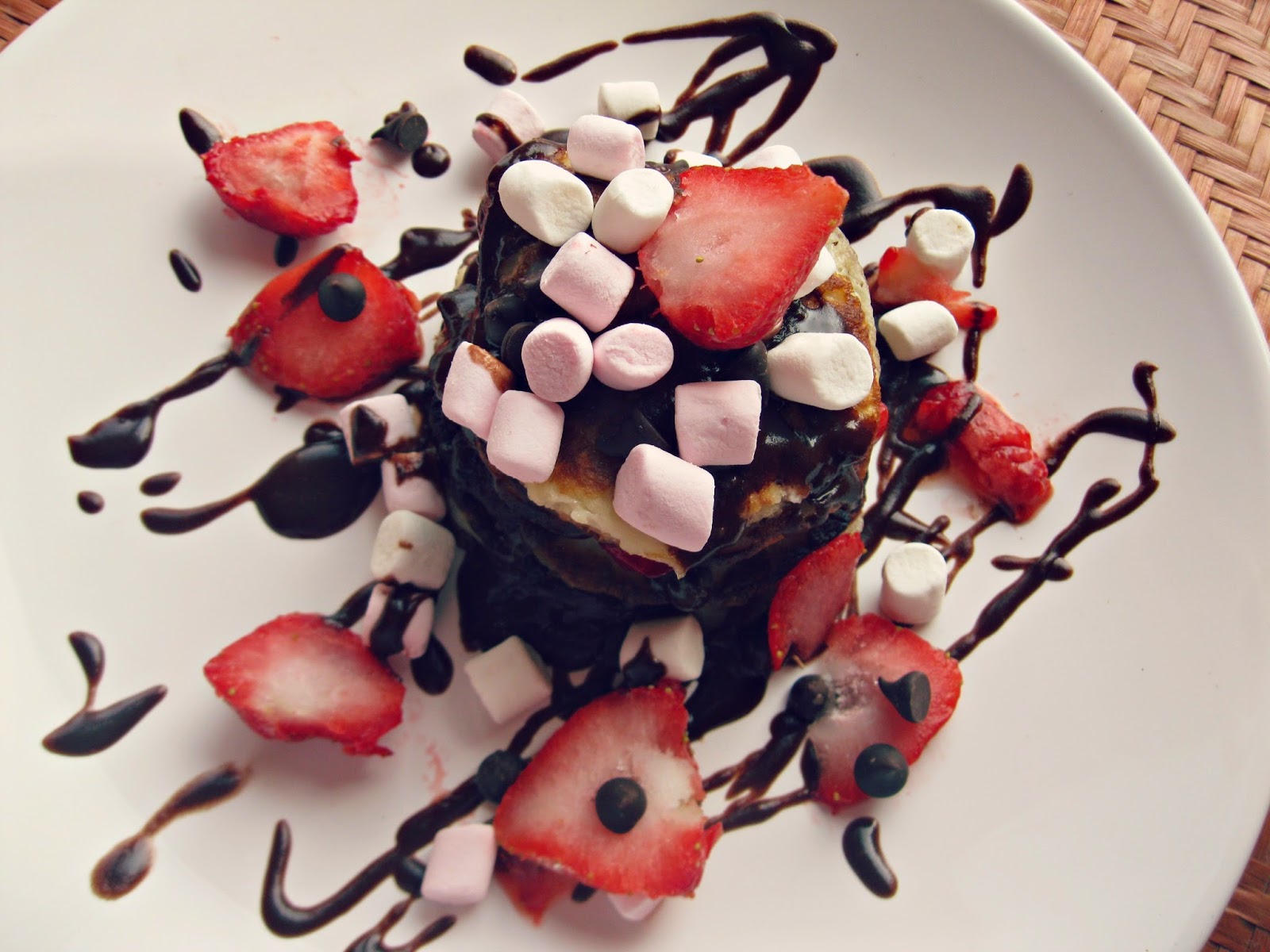 Tegime Miiuga võistlust, kumb serveerib oma pannkooke ilusamini. Kõige esimene vahukommide, maasikate ja sokolaadiga pannkoogikuhja pilt on Miiu kätetöö ning see viimane pilt siin on minu "kunstiteos". Mulle vist ikka pole seda kunstiannet antud, et oskaksin asju ilusti serveerida..