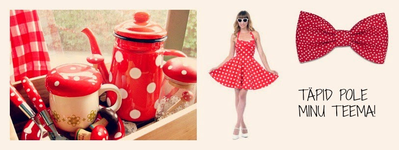 Punase-valge täpilised nõud, riided, kardinad... palun ärge sattuge mu silma alla! Mida suuremad täpid/mummud on, seda õõvastavamad nad minu silmis on. Kui tegu on pisikeste täppidega ning värvikontrast ei ole nii suur, siis ei häiri need mind nii palju. Samuti pole minu arvates nii hullud näiteks tumesinisel taustal pisikesed valged täpid.. sellise mustriga kleidi paneksin ma vb isegi selga, aga punasel taustal lärakad valged täpid... KOHUTAV! Ma ei tea, mis täpi-foobia mul on...