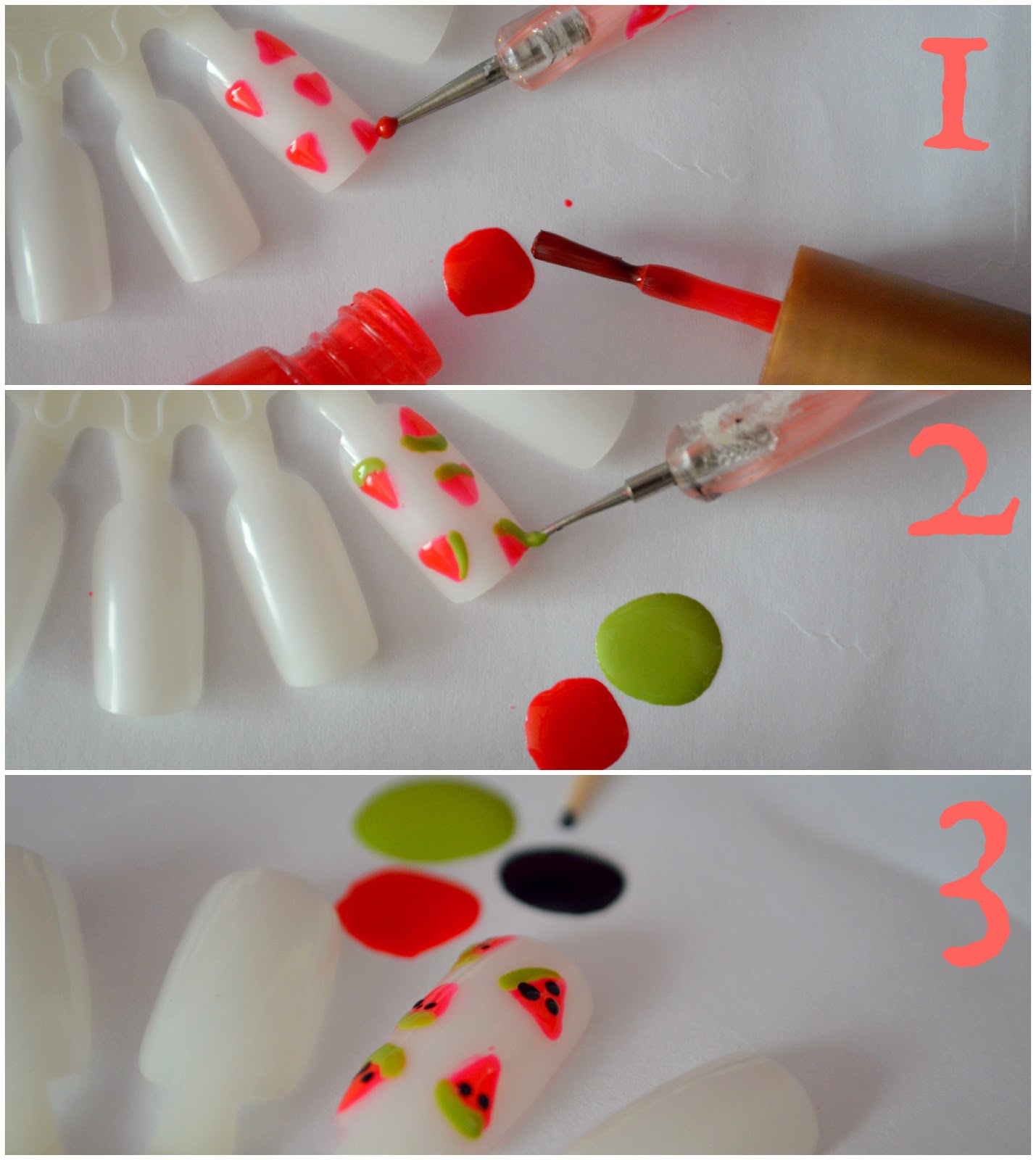 Värvi nimetissõrm ja nimetasõrm valgeks ning ülejäänud punakasroosaks. Valgetele küüntele joonista punaka tooniga kolmnurgad ning seejärel lisa neile rohelised koored. Ära unusta miniseemneid, mis täpita juurde musta küünelakiga. Kui kunstiteosed on täielikult kuivanud, kata need pealislakiga ning valmis nad ongi!
