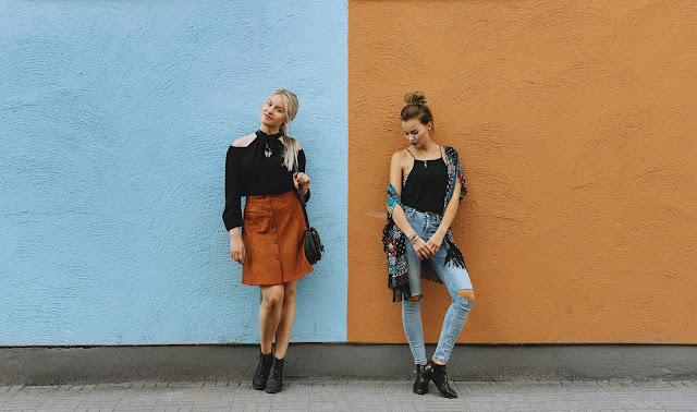 Kusjuures täiesti juhuslikult kõndisime sellest majast mööda Vanalinnas ja vaatasin, et oh lahe sein. Ja siis Liina omakorda avastas juhuslikult, et outfitid matchivad seinaga ja noh, kuna meil statiivi ei olnud, siis pidi ta hiljem meid lihtsalt ühele pildile kokku kleepima:D.